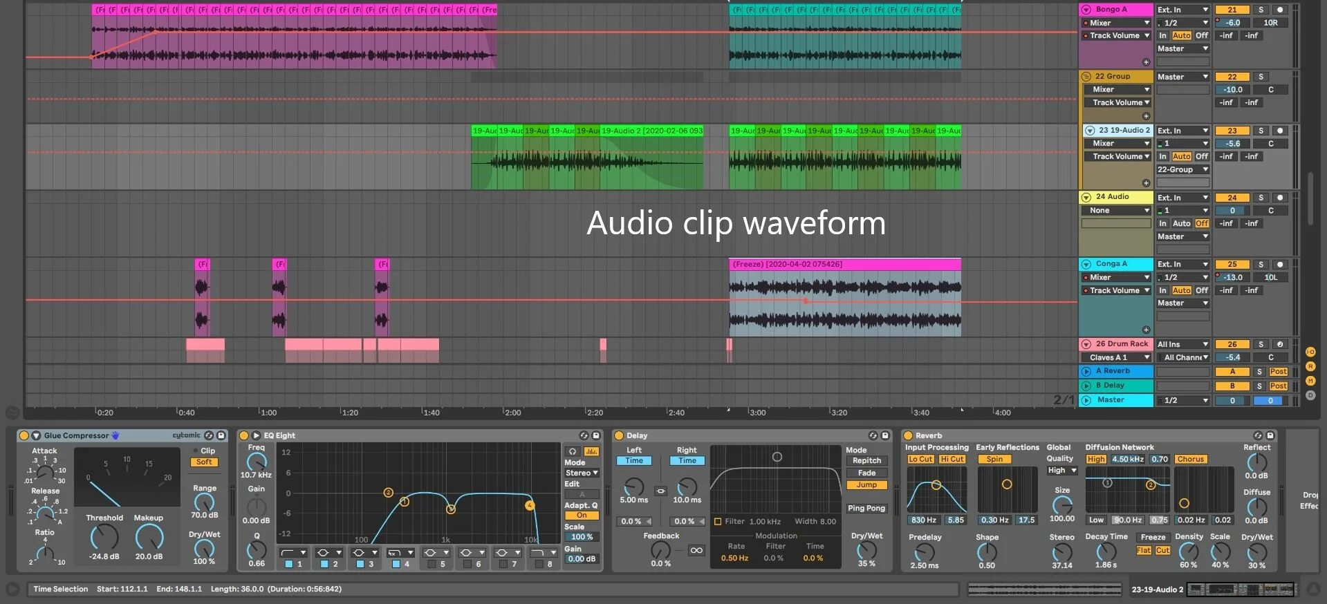 From there it's just a matter of finalising the arrangement, resampling any audio within the project i want to work on as a WAV file rather than midi and doing a medium mix of all the tracks to get them sitting in their correct frequency ranges/volumes as to not compete with each other. Below you can see some percussion I recorded, chopped and glued back together to get the desired sound. Finally i export everything out as stems, individual or instrument group WAV files for Final mixing and Mastering.