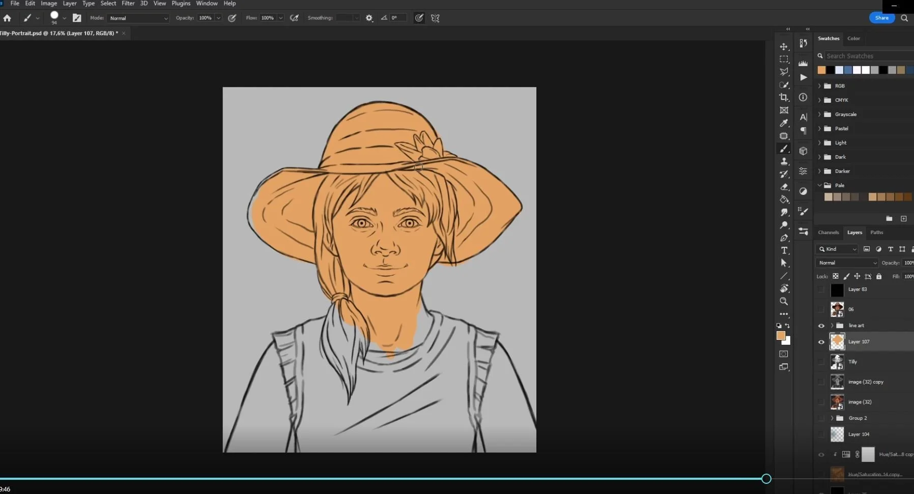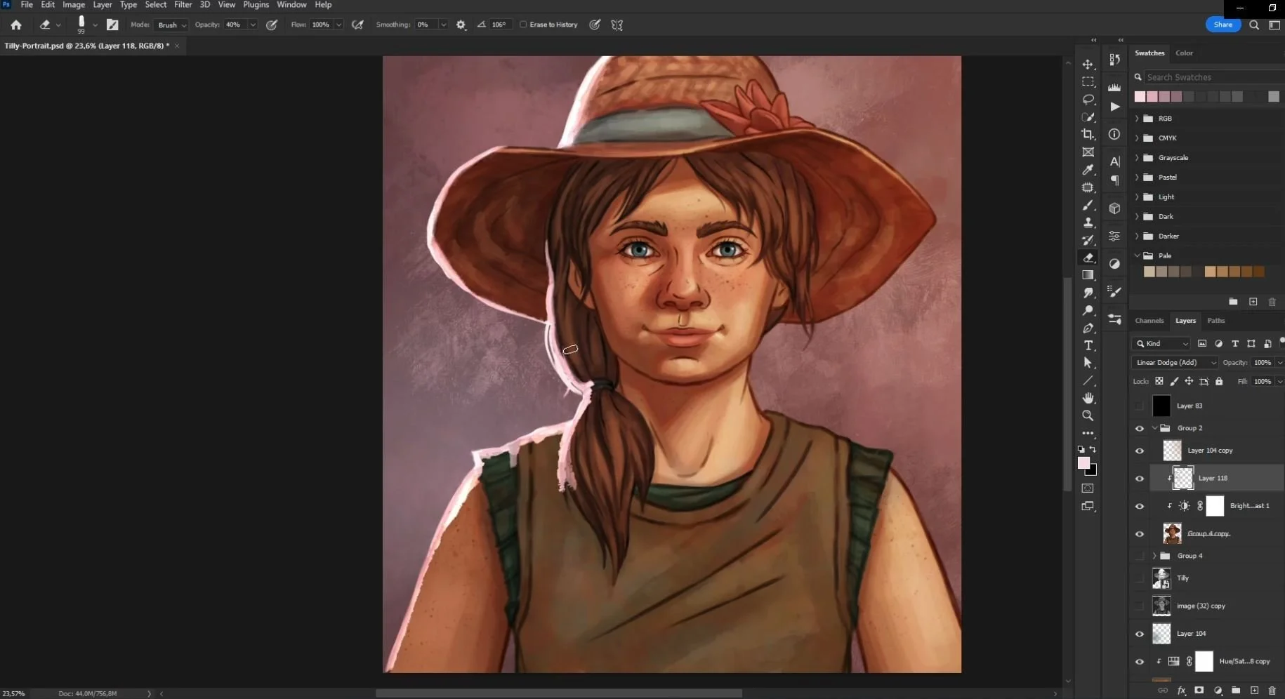 I start painting on each separate layer with a combination of different textured brushes. I usually start with the skin and face first to establish the direction of the lighting and the overall color tone and move out from there, using smaller finer brush details on the face and larger brushier strokes on the clothes, hair and other accessories. I will also add various multiply layers on top using the lasso tool to create hard cast shadows in areas where they are needed or soft linear dodge layers on the areas catching the light such as the cheeks, nose and forehead.