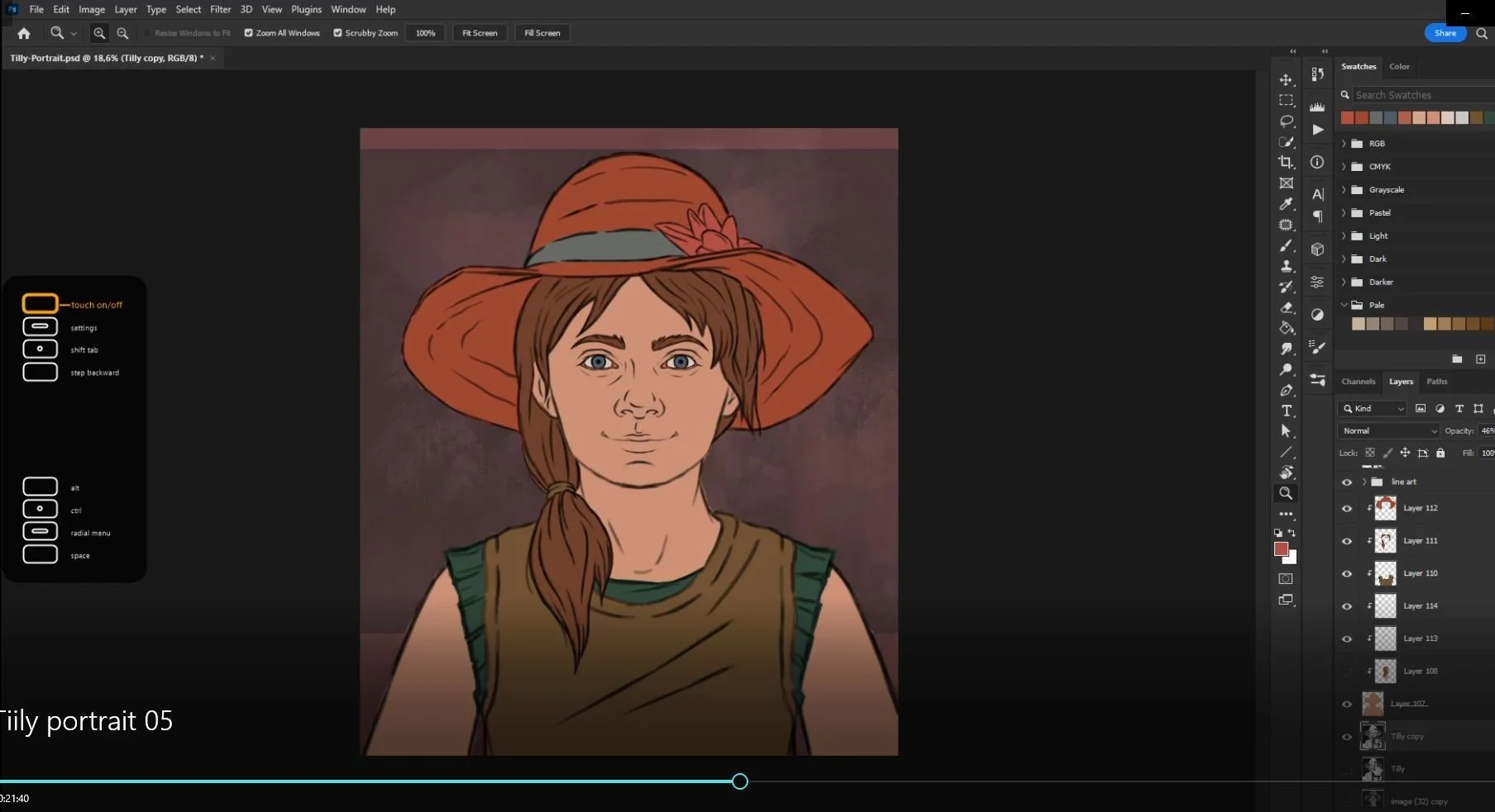 I might adjust the hue of the background color to fit better with the colors of the character. I end with a soft warm glowing gradient on a low opacity linear dodge layer on the right side of the portrait to give that feeling of warm sunlight being cast over the character.
