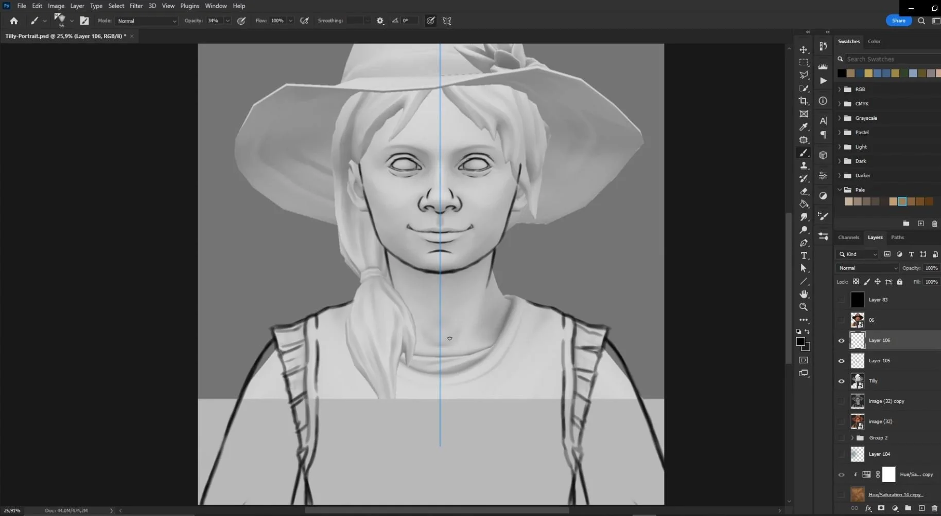 I begin by importing the rendered images of the model and texture into my Photoshop file and making sure the character’s face fits within the specific guides set in the PSD template I created for myself. I will start by tracing over the 3D model’s face using symmetry at first to speed things up and then later without the symmetry tool on so it doesn’t look too symmetrical and unnatural. I use a tapered brush with a pencil texture to give it that sketchy drawn feel. I might keep the line art all on one layer or draw each element on different layers depending on what works best for me on that particular portrait.